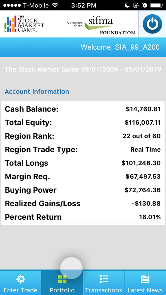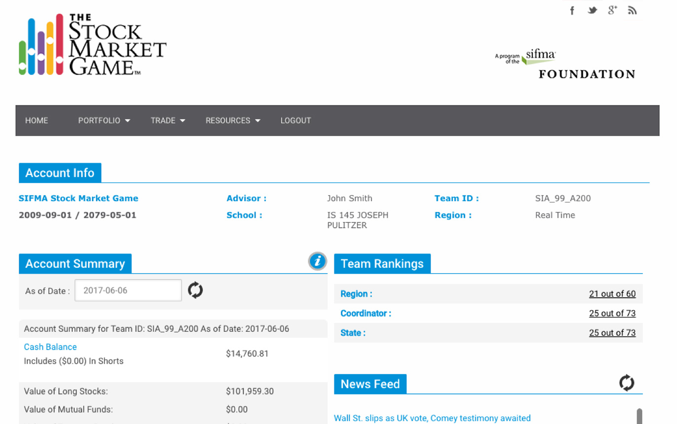 Students get to trade and manage their own virtual $100,000 investment portfolio.